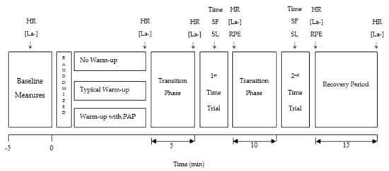 After arriving, each participant remained seated for 5 min and baseline measurements of heart rate (HR; Vantage NV; Polar, Kempele, Finland) and blood lactate concentrations([La−]; Lactate Pro LT 1710; Arkray Inc., Kyoto, Japan) were then assessed. Each volunteer was then randomly assigned to a warm-up protocol (Figure 1).