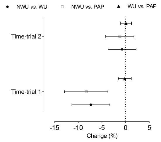 Mean changes (±90% CI) verified between conditions, specifically without warm-up (NWU), after typical warm-up (WU) and after WU complemented with ballistic exercises (PAP) in each 100 m time-trial.