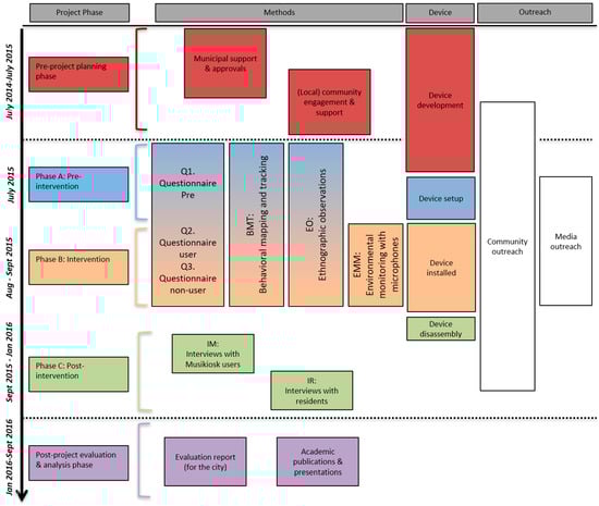 The research project had five distinct phrases spanning more than 18 months: a pre-project, planning phase; Phase A: the pre-intervention; Phase B: intervention; phase C: post-intervention; and a post-project evaluation and analysis phase. The first four of these phases provided the core data reported in this paper. The central phases A, B, and C have been labeled using this separate nomenclature to facilitate comparisons between the experimental conditions arising from the installation of the Musikiosk.