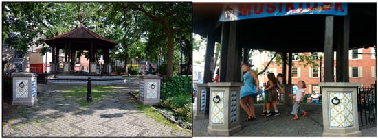 Ample evidence shows that large urban parks dominated by greenery have measurable effects on aspects of the aforementioned restorativeness as well as stress relief for their users [,,]. However, the question is whether the various health-related benefits apply at smaller scales. The smallest urban public parks, called “pocket parks” [] by some in the literature, are often as busy as the surrounding city. While these pocket parks have received attention in the design literature, there is not much information available about their potential benefits; they have been left disproportionally understudied, despite intuitive or explicit knowledge on the functions that they serve for the local population [], including acting as a setting for social interactions and encouraging physical activity in neighborhoods that otherwise lack access to public spaces []. A study by Peschardt and Stigsdotter [] confirms the extensive use of pocket parks for socializing purposes, emphasizing also the effect on mental health and restoration, both for “average” and stressed users. For average users, aspects of socialization were essential, whereas for stressed users, nature was more important, corroborating, to a large extent, the findings for larger green urban parks. A follow up study by the same authors [] investigated the features of the pocket park that could encourage their potential effect on the two aforementioned health benefits. They showed that different amenities are expected for encouraging socializing and restoration, with some amenities evaluated at times positively for one activity and negatively for the other (like tables or green groundcovers), demonstrating the difficult challenge of designing a small sized public space affording multiple simultaneous uses and purposes. A laboratory-based study [] showed that, based on visual assessment of pocket parks, they have the potential to afford recovery and restoration-related activities. To our knowledge, the sonic dimension of pocket parks has not been studied; further the function and use of park amenities on the sound environment (and vice versa) is ripe for investigation, though one such study has taken place on a soundscape intervention in a larger public square [].