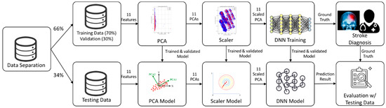 Our deep learning model included 11 variables: gender, age, type of insurance, mode of admission, brain surgery required, region, length of hospital stay, hospital location, the number of hospital beds, stroke type, and the CCI. We used a DNN/scaled principal component analysis (PCA) to automatically generate features from the data and identify risk factors for stroke. We enrolled 15,099 subjects with a history of stroke. Figure 2 shows the system architecture: (1) We used Korea National Health and Nutrition Examination Survey (KNHANES) data for the 11 included variables, where these data were divided into training (66%) and testing sets (34%); in the training set, we used 30% of the samples for validation; (2) we preprocessed data using both PCA and a scaler to convert categorical variables into continuous variables, and to generate models for testing; (3) we then trained the DNN using the scaled PCA variables and (4) compared the predicted results to “ground truth” data (clinician labels). The training and test data did not overlap.