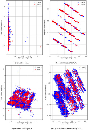 PCA is a simple non-parametric method used to extract useful information from elaborate datasets. In general, PCA preprocessing efficiently defines new features, reducing dimensions to find hidden or simplified structures for inclusion in classification algorithms [50]. However, the dataset that we used featured major categorical/binary and minor continuous variables. The former variables should not be input into a DNN classifier because they lack detailed information. We used the PCA maximum-attribute filter to convert all 11 binary or categorical variables into 11 continuous variables to minimize data discretization. Figure 3 shows the first and second principal components of four different PCAs: (a) a normal PCA; (b) a PCA with a standard scaler; (c) a PCA with a min/max scaler; and (d), a PCA with a quantile transformer scaler. A DNN/PCA-quantile-transformer scaler afforded the best performance.