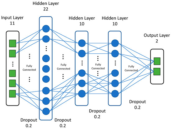 We employed simple feed-forward neural networks, trained using a standard backpropagation algorithm, in our deep (four hidden layers) learning models. For each DNN, we adjusted several hyperparameters, including the number of hidden layers, the number of neurons in each layer, the activation function, the optimization method, and the regularization technique. The best DNN featured four hidden layers with 22, 10, 10, and 10 neurons, respectively. The last layer, with one neuron, yielded a regression output. Accuracy served as the optimization loss function (we applied regularization terms). The DNN featured ReLU activation [51] in each layer; the dropout [52] probability was 0.2 for each layer. We used Adam optimization [53] with 0.001 for learning rate and L2 regularization during training; this optimizer is robust in terms of hyperparameter choice and, empirically, has shown very good performance. We applied batch normalization [54] after the first two layers to counter overfitting and ensure stable convergence. Figure 4 shows the architecture of the proposed DNN.