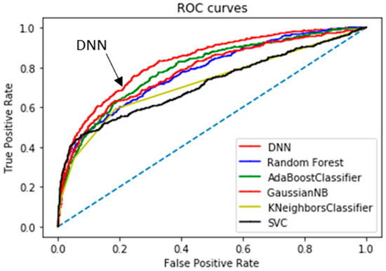 Table 3 summarizes the computational results yielded by the classification algorithms; we list thresholds, confusion matrix values, and five performance parameters; the AUCs of the top two classifiers are highlighted in bold. Considering all model parameters, the optimal stroke probability threshold was 0.13, with a model Acc of 84.03%, Sn of 64.32%, Sp of 85.56%, and PPV of 25.7%. We determined the thresholds of each classifier to make the balance between the sensitivity and specificity empirically. Compared to the commonly used performance metrics (Sn, Sp, PPV, and Acc), the area under the curve (AUC; a single value) better reflects algorithm performance [57]. Our method afforded an AUC of 83.48%; a comparison of the receiver operating characteristic (ROC) curve (indicating the predictive performance of our DNN/scaled PCA model) and the ROC curves of other classifiers is shown in Figure 6. The DNN/scaled PCA algorithm was optimal, followed by the AdaBoost classifier. Table 4 shows the comparison of the performance using 10-fold cross validation in order to verify the results from Figure 6 and Table 3. The AUCs of the top two classifiers are highlighted in bold, such as DNN and ADB. These results clearly support the conclusion that the DNN/scaled PCA algorithm outperforms the other five algorithms.