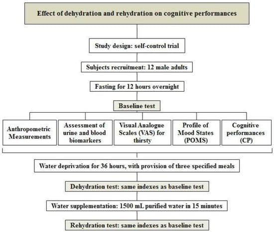 In this study, the method of water deprivation used was inducing dehydration, whereas water supplementation was used to induce rehydration. Cognitive performance, mood, and thirst were measured three times: during the baseline test after fasting for 12 h, during the dehydration test after water deprivation for 36 h, and during the rehydration test after water supplementation.