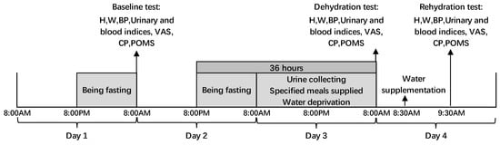 Day 2: All participants arrived at the designated location for the baseline test at 8:00 AM. The first morning urine samples were collected by participants themselves in sterile, disposable urine sample cups. The urine osmolality of participants was tested immediately by professional laboratory technicians at a hospital. Venous blood samples from the elbow were collected to test blood osmolality and blood glucose. Anthropometric measurements of height, weight, and blood pressure were also conducted. Then, a visual analog scale (VAS) for thirst, a profile of mood state (POMS) questionnaire, and a cognitive performance test were finished. After the baseline test, participants could drink water and have meals. Then, from 8:00 PM on day 2 to 8:00 AM on day 3, all participants were asked to fast, forgoing intake of both food and beverages.