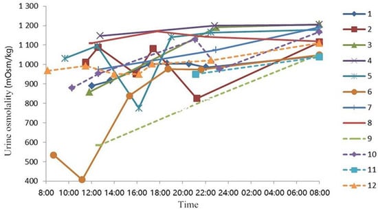 On day 3, the average total fluid volume obtained from food was 939 ± 146 mL, 24 h urine volume was 799 ± 145 mL, and the number of voids was 5 ± 2. These data are presented in Online Resources Table S1 (in supplementary materials). The average urine osmolality was 1004 ± 163 mOsm/kg. Changing trends of urine osmolality are shown in Figure 3, and the volume and osmolality for each spot urine sample are shown in Online Resources Table S2. Among the 12 participants, 9 (75%) were in a state of dehydration for the whole of day 3 (Table S3).