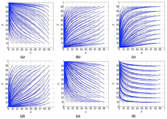 Dynamic evolutionary paths for the strategies of government departments and CEEICA individuals: (a) Condition No. 1; (b) Condition No. 2; (c) Condition No. 3; (d) Condition No. 4; (e) Condition No. 5; and (f) Condition No. 6.