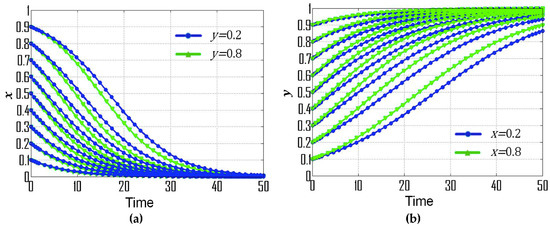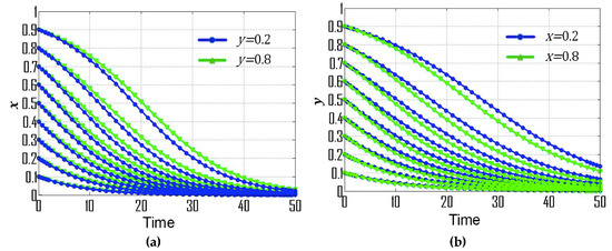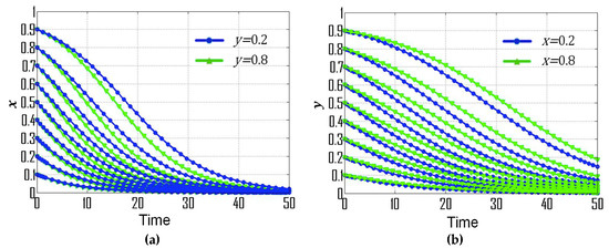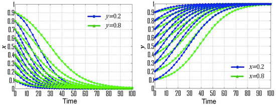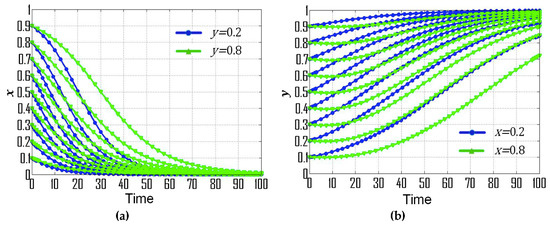 (1) If , , and , then the replicator dynamic equations for this special case are: , , , which is consistent with condition No. 1. According to the dynamic evolutionary paths of their strategies (Figure 1a), point is the ESS, which indicates that the ESS of government departments and CEEICA individuals are the punitive policy and the active plan, respectively. Figure 2 exemplifies the dynamic evolutionary paths for each of the strategies. In Figure 2a, a series of 0.8 (green line) and 0.2 (blue line) curves are paired according to the x value (the probability of playing the “motivating policy” strategy). In each pair, the point values of the 0.8 curves are constantly smaller than those of the 0.2 curves, indicating the rate of convergence of the government departments’ strategies will increase when there is a shorter probabilistic distance between the initial strategy of CEEICA individuals and an active plan. It can also be seen that a declining x value can shorten the convergence time of curves, which implies the rate of convergence is increasing with a dropping probability of the following “motivating policy” strategy. In Figure 2b, a series of 0.8 (green line) and 0.2 (blue line) curves are paired based on a y value (the probability of playing the “active policy” strategy). In each pair, the point values of the 0.8 curves are constantly larger than those of the 0.2 curves, indicating the rate of convergence of CEEICA individuals’ strategies will increase when there is a shorter probabilistic distance between the initial strategy of the government department and a motivating policy. It should be noted that rising y values can shorten the convergence time of curves, which implies the rate of convergence is increasing with a raising probability of the following “active plan” strategy.