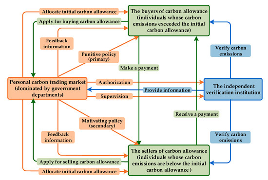 The above ESSs are determined based on the assumption of stable operation of the personal carbon trading market, thus, a stable operational mechanism is important and necessary for a personal carbon trading market. From the perspective of stability, the operational process of the personal carbon trading market is described as follows (Figure 8). First, government departments allocate an initial carbon allowance to each individual based on the cap-and-trade system and equity rule. Second, CEEICA individuals decide to adopt an active or passive plan by considering the policies of the government departments (e.g., punitive policy or motivating policy) and other factors (e.g., social atmosphere, climate and environment, and personal characteristics). Third, an independent verification institution verifies the actual carbon emissions of individuals and provides related information to government departments. Finally, CEEICA individuals apply to buy (or sell) carbon allowance, and they then trade with sellers (buyers). In addition, the verification process for the actual carbon emissions of individuals should be strictly supervised and carbon emissions information should be fed back rapidly to individuals, especially CEEICA individuals.