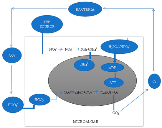 Microalgae are considered to be one of the favorable wastewater agents due to their ability to absorb nutrients and convert them to biomass [50]. During the brewery wastewater treatment, nitrogen, phosphorus and other nutrients present in the wastewater are adequately absorbed by microalgae for their growth. Microalgae, through their photosynthetic activities, freely release oxygen which is utilized by bacteria in the wastewater. Microalgae also fix CO2 by assimilating HCO3 from CO2 via respiration. Figure 1 shows the mechanism of the bacteria-microalgae relationship in wastewater.