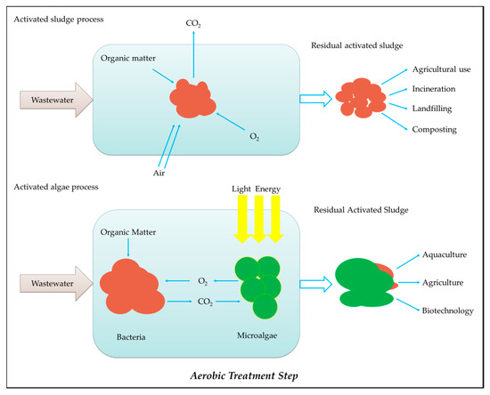 Microalgae release oxygen as a byproduct during wastewater treatment and this is utilized by aerobic bacteria to further degrade the remaining organic loads. This reduces the energy cost compared to the cost of mechanical energy for aeration during conventional wastewater treatment. Approximately, 1 kWh of electrical power is needed to remove 1 kg of BOD in the activated sludge process. During this process, 1 kg of fossil carbon dioxide is produced from power generation. Microalgae do not require any energy input to remove 1 kg of BOD from brewery wastewater and produce 1 kWh of electric power through methane production by algal biomass [64].