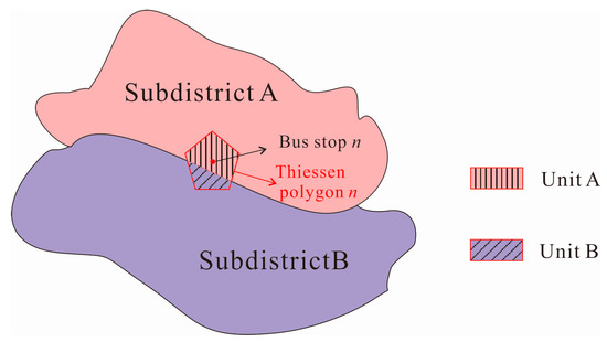 On macro scale, seven administrative districts are viewed as study groups and 86 subdistricts within are taken as minimum spatial units within groups. While on micro scale, 86 subdistricts are taken as study groups and the theory of Thiessen polygon is adopted for the division of minimum spatial units, for any point in a Thiessen polygon has the closest distance to the corresponding polygon center [28]. 1256 bus stops are taken as center points to create 1256 corresponding Thiessen polygons (Figure 3). We assume that people whose location falls within that polygon tend to choose the only bus stop within and the polygon’s attribute (travel distance and travel time to hospitals) could be represented by the corresponding bus stop. Polygons that fall in each subdistrict are viewed as minimum spatial units of that group. For the polygons that fall on the boundary of two subdistricts, they are divided into two units (Figure 4). Unit A belongs to subdistrict A and its population density is the same as it is in subdistrict A. Same as unit B. The travel time to hospitals in unit A and B is the same, representing by bus stop n. After the division, there are 2170 minimum spatial units within 86 study groups (Figure 5).