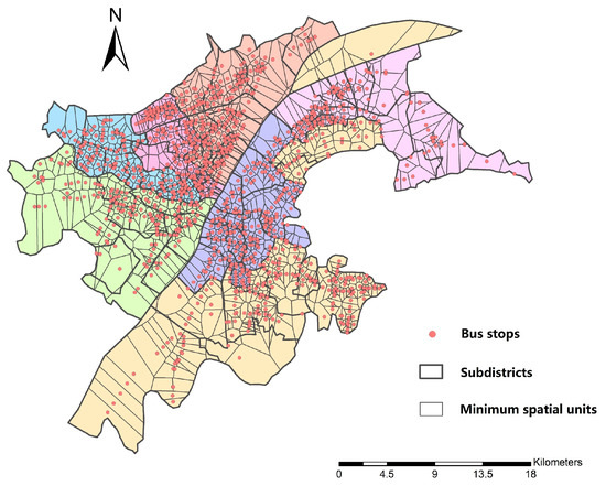 represents the accessibility to hospitals of i th bus stop. n (n = 24) is the number of 3A hospitals within the whole area. k (k = 1256) is the total number of bus stops within study area. is defined as the travel cost between bus stop i and hospital j, usually being travel time or distance. As travel time is a reliable indicator of accessibility which could reflect the actual traffic condition, it is chosen to represent travel impedance in our study [30,31]. is denoted as each sub-region’s overall accessibility while N is the number of bus stops within corresponding sub-region m. The larger is, the less convenient the region could be. The simple model can reflect the basic transit service resources to 3A hospitals within the whole study area.