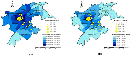 The accessibility calculated by two models on subdistrict scale: (a) simple model; (b) gravity model.