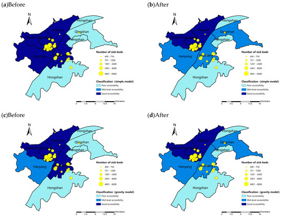 Classifications of accessibility to hospitals on administrative scale: (a,b) simple model; and (c,d) gravity model.