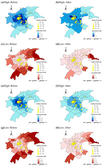 However, some limitations still need to be considered. Firstly, in the calculation of hospital accessibility, some important factors such as residents’ preference of hospitals, different travel modes as well as their income are not taken into consideration [43,44,45]. Secondly, variations of accessibility in spatiotemporal patterns are not studied. Results of accessibility could vary during the course of the day or the week, but we do not investigate the fluctuation [30,46]. At the next step, we will consider these problems and conduct more comprehensive analysis.