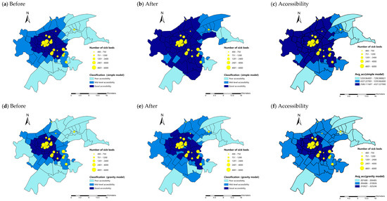 Classifications of accessibility to hospitals on subdistrict scale before and after filtering out the influence of spatial autocorrelation: (a,b) simple model; and (d,e) gravity model and corresponding average accessibility maps(c,f).