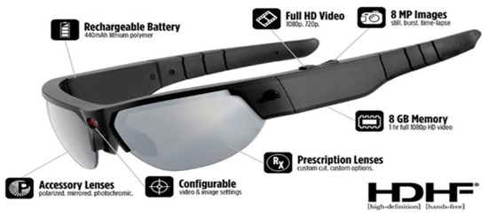 Wearable Video Device—Pivothead Smart (Pivothead, Denver, CO, USA): The Pivothead Smart is one of the most technologically advanced WVDs (Figure 1 and Figure 2). The camera is centered in the bridge of the glasses for the truest first-person perspective possible and it features an 8 MP Sony CMOS sensor for capturing full 1080p HD MP4 video at 30 frames per second as well as 8MP stills (Figure 3). A 32 GB memory card can be used, providing up to 8 hours of video recording per card at 1080p, and they possess a self-contained battery, allowing six to eight hours of recording time. The field of vision is 77 degrees, which approximates the human 90-degree field of vision, and they can be fitted with polarized prescription RX lenses. The Pivothead also allows for audio recordings, time and date stamps, and geolocation capabilities.