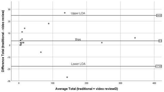 Bland–Altman plots for total (traditional BWM vs. expert review of BWM videos).