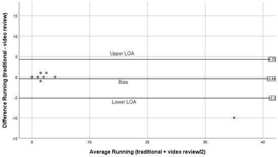 Bland–Altman plots for running (traditional BWM vs. expert review of BWM videos).