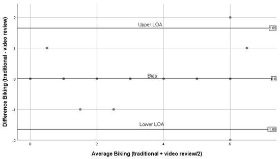 Bland–Altman plots for cycling (traditional BWM vs. expert review of BWM videos).