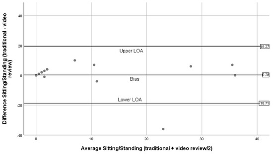 Bland–Altman plots for sitting/standing (traditional BWM vs. expert review of BWM videos).