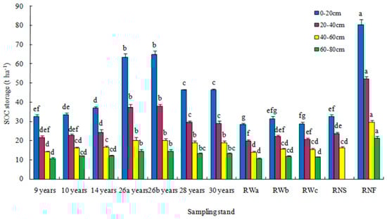 Surface soil (0–20 cm) organic carbon storage of mixed plantations ranged from 32.55 to 64.89 t C ha−1, with an average value of 46.31 t C ha−1 (Figure 1). Compared to the reference wasteland, SOC storage increased significantly at 0–20 cm depth after 9 years of reforestation, at 20–40 cm depth after 14 years of reforestation, and at 40–60, 60–80 cm depth after 26 years of reforestation. Compared to reference natural recovery shrub grassland, SOC storage of mixed plantations was significantly higher at 0–20 cm depth at the age of 14 years old and at 20–40, 40–60 cm depth at the age of 26 years old. SOC storage of mixed plantations was significantly lower than that of reference natural forest for all soil layers.