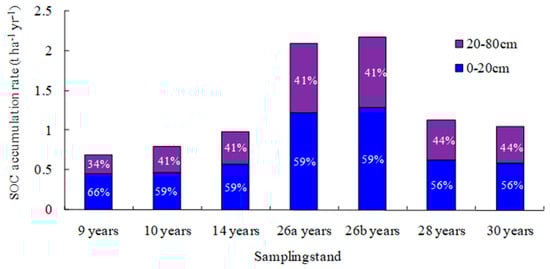 Note: 9 years, 10 years, 14 years, 26a years, 26b years, 28 years, and 30 years stand for the mixed plantation stands at the age of 9 years, 10 years, 14 years, 26 years, 26 years, 28 years, and 30 years, respectively. Percentages within the green and blue rectangles denote the proportion of SOC sequestration rate at 0–20 cm soil layer and at 20–80 cm soil layer, respectively, in 0–80 cm soil profile.