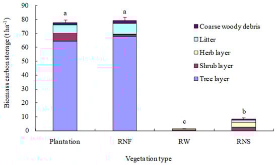 Though tree biomass carbon storage was the main component of total biomass carbon storage in both 30-year-old mixed plantation and reference natural forest, the secondary biomass carbon still accounts for 17% and 14%, respectively, in mixed plantation and reference natural forest. The rank of secondary biomass carbon stocks in the 30-year-old mixed plantation was as follows: litter compartment > shrub layer > coarse woody debris compartment > herb layer. The rank of secondary biomass carbon stocks in reference natural forest was as follows: litter compartment > coarse woody debris compartment > shrub layer > herb layer.