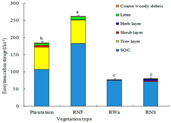 In comparison to mixed plantations and reference natural recovery shrub grassland, reference natural forest was the most important ecosystem carbon pool. Total ecosystem carbon storage was 262.61 t C ha−1, which was 184.75 t C ha−1, 181.73 t C ha−1, and 77.11 t C ha−1 higher than that of adjacent reference wasteland, reference natural recovery shrub grassland, and 30-year-old mixed plantation, respectively (Figure 4). The reasons for high total ecosystem carbon storage in reference natural forest were as follows: The reference natural forest was protected as “Fengshui” forest, disturbed lightly for some collections. Further, reference natural forest had good structure, with well-developed understory and a large quantity of litter in the understory, which could increase rainwater infiltration into the soil in rain seasons, reducing water evaporation in dry seasons. Dense litterfall could make soil maintain good soil moisture, reduce the time below the plant withering moisture, and facilitate plant growth and SOC input. Therefore, the natural forest should be protected. Once the natural forest was destroyed and degraded into wastelands, a large quantity of carbon would be released into the environment.