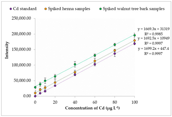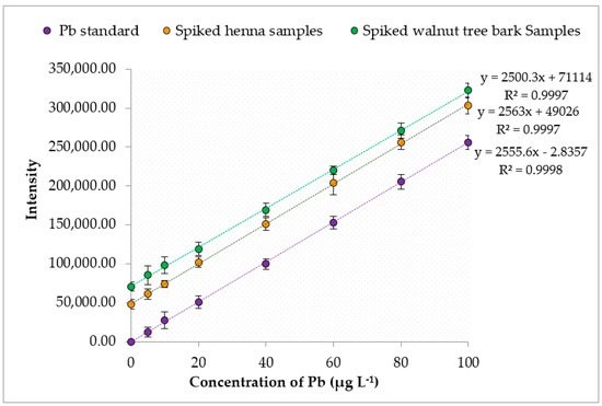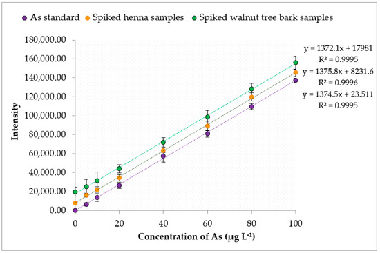 The results were validated through recovery tests. The recoveries of the studied heavy metals were evaluated by adding Pb, Cd and As standard solutions ranging from 5 µg·L−1 to 100 µg·L−1 to the henna and walnut tree bark samples. The samples were digested and then analyzed by ICP-MS at optimum conditions. The absolute recovery value for the entire calibration range of each heavy metal was obtained from the ratio between the slope of the line corresponding to the spiked henna or walnut tree bark samples and the slope of the line for direct standard analysis by ICP-MS, as shown in Figure 1, Figure 2 and Figure 3. The obtained recoveries of Pb, Cd and As in the henna samples were 100.3%, 99.6%, and 100.1%, respectively; and in walnut tree bark samples, 97.8%, 99.8% and 98.2 (Table 4). The high recovery values clearly indicated the absence of analyte loss during the sample preparation step and that sensitivity (intensities) was not influenced by the henna and walnut tree bark samples matrix, which allowed us to use a linear calibration technique without needing a standard addition technique.