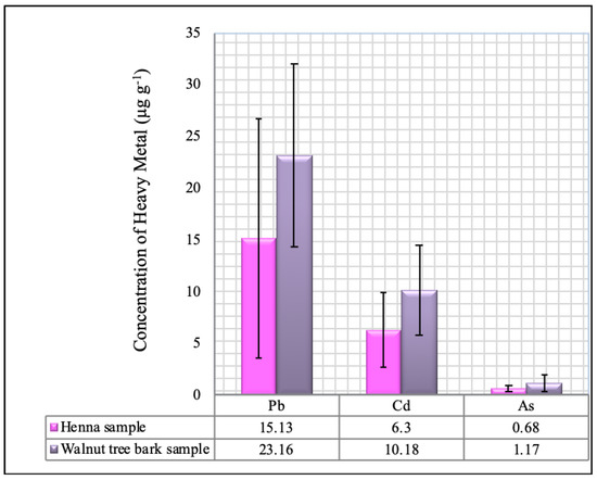 The main enthusiasm for the current research is to have an informative vision of the heavy metal concentrations (i.e., Pb, Cd, and As) in the henna and walnut tree bark in Libya. Indeed, the accurate determination of heavy metals in cosmetics is important as they have a narrow range of safety between adequate amounts and excessive consumption. Among the various methods proposed for heavy metals analysis in cosmetic products, inductively coupled plasma mass spectrometry (ICP-MS) is the most frequently used due to its relative simplicity, low sample volume requirements, and low detection limits [72,73]. A method using microwave acid digestion, followed by ICP-MS determination for the analysis of heavy metal content in the henna and walnut tree bark samples was used for this study.