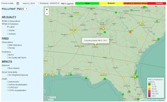 To facilitate the visual analysis, we developed three methods of displaying the data per user’s request, through the web server. The first two methods present the data either as polygons (contours) or as point markers on the map. The background map is provided through OpenStreetMap [25], which supports spatial navigation, and can zoom in for very detailed local geographical information. The spatial distributions of the air quality index (AQI) grades or the burn impacts are presented through the Leaflet function for polygons in the GeoJSON format [26]. Points of air quality observations, HMS detections, burn locations and permits data are presented on the map as various markers, through a Leaflet pointToLayer function. In the third method, site-specific observations and forecasts are presented, using time-series plotting functions from the D3.js library [27]. All the above displaying components are realized by using Javascript functions, and they support interactive capability to display data according to the selected date, pollutant (i.e., ozone or PM2.5), and/or data type. A user’s manual describing how various visual analyses are conducted with SIPFIS, using its interactive functions, can be found in Appendix A.