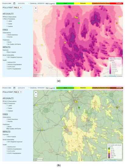 (a) The burn impact forecast on 5 March 2018, and (b) the air quality forecast after including the impact of burns.