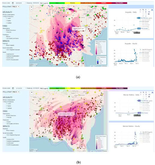 Several types of analyses can be performed with the current interfaces of SIPFIS. These include fire analyses comparing the locations of permitted burns to locations of satellite-detected fires, the areas of the permitted burns to the satellite-derived burned areas, and forecasts of the burn activity to permits and satellite fire detections. As an example, the comparison among HMS detection, permits, and forecast burns on 10 March 2016, is shown in Appendix A (Figure A5). SIPFIS can be used to access various forecasting products for personal use, such as residential community level or mobility-based air quality forecasts. As an example, starting with the forecast displays in Figure A1 and Figure A4, a user can further zoom into the background map to residential community levels in Georgia, and by changing the dates, the AQI grades around their neighborhood for the next three days can be obtained. SIPFIS can also be used as a screening tool for fire-related exceptional events that led to exceedances and violations of air quality standards, or a supporting analysis tool to assist and evaluate air quality forecasts. Forest- and air quality managers, as well as public health practitioners in health departments, can also use SPIFIS to evaluate prescribed burning operations that aim for minimal human exposure to fire smoke. Here, the applications for four such analyses are illustrated in detail by the examples below.