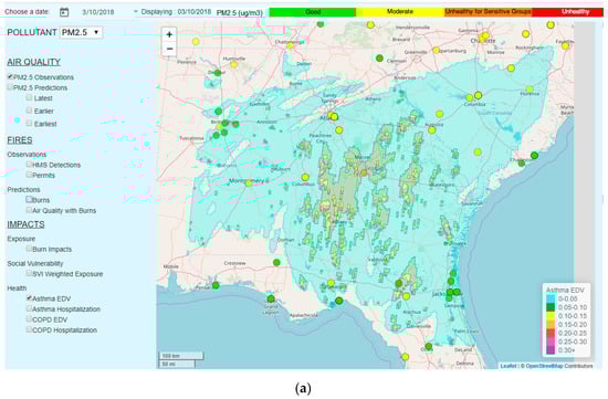 - Check the box for “Asthma EDV”, “Asthma Hospitalization”, “COPD EDV”, or “COPD Hospitalization” under “Impacts” on “Health” on the left-side menu, to show the spatial distributions of the increased relative rates, respectively, for EDV, and the hospitalization of asthma or EDV, and of COPD patients due to the forecasted smoke exposure (Figure A7).