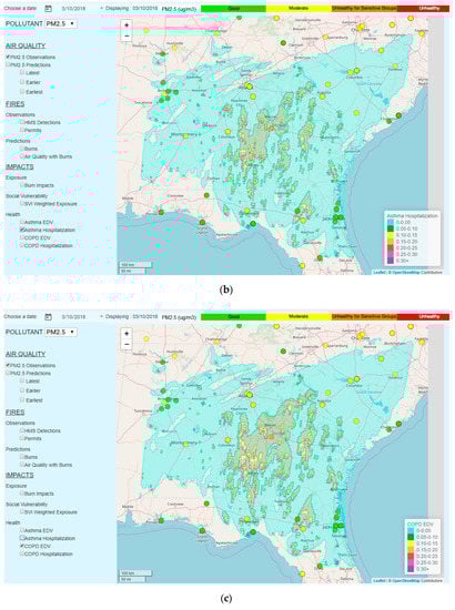 For 10 March 2018, HiRes2 predicted extensive prescribed fires in Southern Georgia which could have increased exposures to PM2.5 by a large margin, especially at locations impacted by smoke plumes, and which consequently could have caused a significant increase in the number of EDV and hospitalizations of both asthma and COPD patients (Figure 8). The predicted increased rates of EDV and hospitalization were as large as ~40% at the locations shown as purple spots on the map. This information can be used by asthma and COPD patients living near the influenced areas, to limit outdoor activities on that particular day, and also by local health care professionals, to prepare in advance for increased EDV and hospitalization frequencies by asthma and COPD patients.
