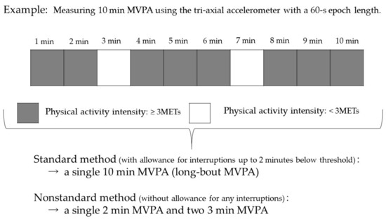 The accelerometer estimates the intensity of physical activity based on METs. The algorithm for the prediction of METs was established by the Douglas bag method in a controlled laboratory setting [16,17]. Physical activity with an accelerometer intensity of 3 METs or higher was defined as MVPA [18]. Based on a previous study, we categorized MVPA by the length of each bout (1–4 min., 5–9 min., 10–19 min., 20–29 min., and ≥30 min.) [9]. We described the number of MVPA bouts performed in each bout length category, the percentage of MVPA bouts of a particular bout length within the total daily MVPA bouts (total MVPA bouts), total MVPA time by bout length, and the percentage of this MVPA time among total daily MVPA time (total MVPA time) by sex. Two definitions of long-bout MVPA were used in this study, compatible with 2 MVPA recommendations by the 2008-PAG and 2nd PAG (Figure 1). The first is the standard definition used in a previous study [14], defined as 10 or more consecutive min with an intensity of 3 METs or higher, with allowance for interruptions up to 2 min below threshold (standard method, Figure 1), and the second one was without allowance for any interruptions (nonstandard method, Figure 1). Differences between the sexes regarding each activity time and proportion were analyzed using the Mann-Whitney U test.
