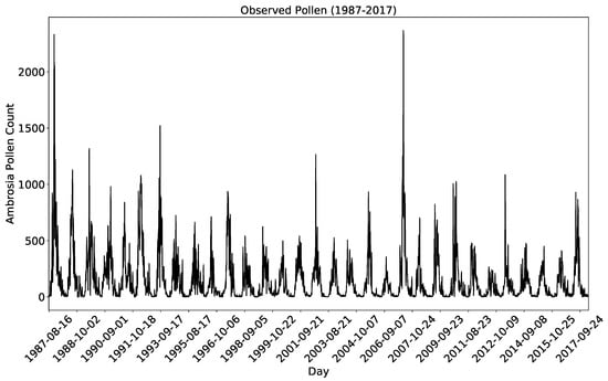 Pollen sampling was performed at the University of Tulsa, Oklahoma (36.1511° N, 95.9446° W). Preliminary analysis of the pollen data measured from 1987–2014 and a detailed description of the technique and study area is given by []. Figure 1 shows a time series plot of the daily pollen concentration measurements made from 1987 to 2017 during the Ambrosia pollen season (15 August–31 October).