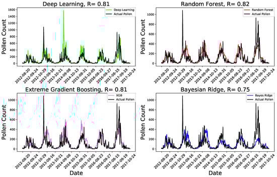 Figure 2 shows the pollen abundance estimated using the four machine learning methods (colored lines) and the actual pollen abundance (black line) for 6 years from 2012 to 2017. The black curve in all subplots shows the actual pollen withheld for independent testing. The colored plots show the estimated pollen abundance using the independent test dataset. The type of machine learning method used and Pearson correlation between the forecasted and the actual pollen are given at the top of each figure for all subplots. The Pearson correlation values for deep learning, the random forest, extreme gradient boosting and Bayesian ridge were, respectively, 0.81, 0.82, 0.81 and 0.75.