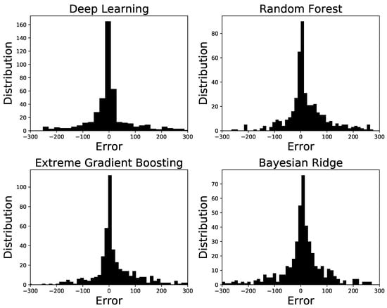 Histogram plots showing the distribution of the errors for the four machine learning methods.