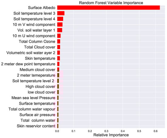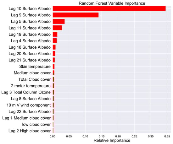 In this research we used twenty-three predictor variables for our machine learning methods. The variables are time lagged by 1 to 30 days so that the total number of predictor variables becoming 31 × 23. We trained the machine learning before and after lagging the variables. The random forest was applied to estimate the variable importance. We found that the surface albedo, soil temperature and total column ozone are among the top most predictor variables. Time lagging of the variables shows that the surface albedo nine to 10 days prior are the most influential predictors.