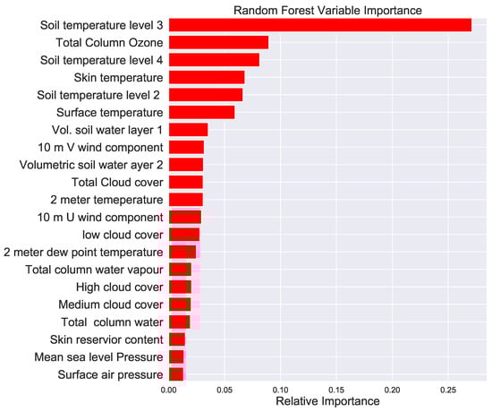 ECMWF reanalysis, Ref. [] data was used as a source of the daily meteorological and land surface contextual data. The predictor variables utilized include the total water column, cloud cover, surface and mean sea level pressures, vertical and horizontal wind speed, soil temperature at various levels, skin temperature, surface albedo, total column ozone, volumetric soil water, dew point temperature at 2 m, surface and 2 m temperature and precipitation, high and low vegetation cover, etc. Table 1 shows the list of our predictor variables and their units.