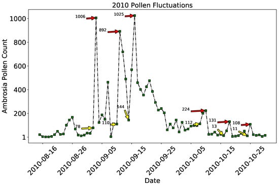 Examples of large scale day to day variations of the pollen abundance for 2010 are exhibited in Figure 7. The yellow arrows in Figure 7 show relatively low pollen abundance just one or two days before a large scale increase in the pollen indicated by the red arrows. The fluctuations are severe during the peak pollen days. For example, the pollen concentration recorded on 2nd October 2010 was just 78, and the following day (3rd October 2010) the pollen concentration sharply ascended to 1006. The 110 and 144 pollen concentrations on October 11 and 16 2010 increased to 892 and 1025, respectively. Similarly, during the pollen end days the abundance varies from 112 on 8th October, 13 on 16th October, 11 on 24th October to respectively 224 on 10th October, 131 on 18th October, 108 on 25th October. Understanding the causes of these large scale fluctuations in terms of atmospheric weather or land surface parameters will greatly help in forecasting the pollen abundance using machine learning.