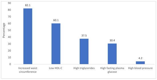 Prevalence of metabolic syndrome criteria in the total sample of nurses. HDL-C: high-density lipoprotein cholesterol.