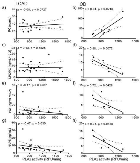 Similarly, PLA2 activity did not correlate with LPC/PC in LOAD (Figure 1c) but negatively correlated (ρ = −0.88 (p < 0.01) with LPC/PC of OD (Figure 1d). Finally, PLA2 activity in LOAD did not correlate with platelet-activating factor-like lipids (PAF-LL) (Figure 1e) but negatively correlated with NP PAF-LL in OD (Figure 1f). The only correlation that was significant across both LOAD and OD was between PLA2 activity and NAPE and only in the NP fractions. PLA2 activity in LOAD negatively correlated with NAPE in NP (ρ = −0.47, p < 0.04) (Figure 1g). NP NAPE levels negatively correlated (ρ = −0.74, p < 0.05) with the activity of PLA2 (Figure 1h).