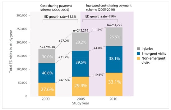 ED visits increased rapidly in Taiwan, and non-emergent ED visits took a significant portion. There was a 46% increase in annual ED visits from 2000 to 2010 (annual ED visits were 179.0 per 1000 population in 2000 vs. 261.3 per 1000 population in 2010) while the growth rate of annual ED visits dropped down by 77.7% after increasing the cost-sharing payment of ED visits in 2005 (ED growth rate was 35.3% in 2000–2005 vs. 7.9% in 2005–2010). There were apparent differences in numbers, growth rates, and distribution among types of ED visits before and after 2005 (Figure 1).