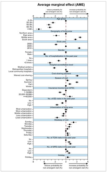 The following are available online at https://www.mdpi.com/1660-4601/16/11/1999/s1, Table S1: Average marginal effect (AME) by factors for non-emergent ED visits from three representative study cohorts (LHID2000, LHID2005, LHID2010) in Taiwan. (n = 1,000,000 for each cohort, total ED visits, n = 475,862).