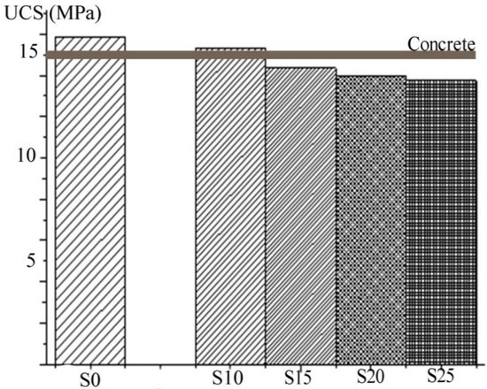 The results of the UCS measurements of solidified products (S0, S10, S15, S20, S25) after 28 days of curing are shown in Figure 1.